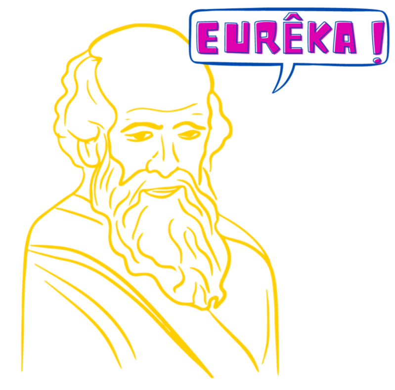 La pièce tombe : notre brave scientifique découvre, pour le plus grand bonheur de nos étudiants, la célèbre poussée qui porte aujourd’hui son nom ! La légende raconte qu’il était tellement content d’avoir résolu l’énigme, qu’Archimede criait, nu, dans la rue « Eurêka! ». Bon, ça… on ne le saura jamais 🤭🍆